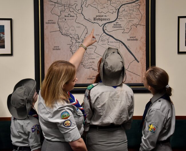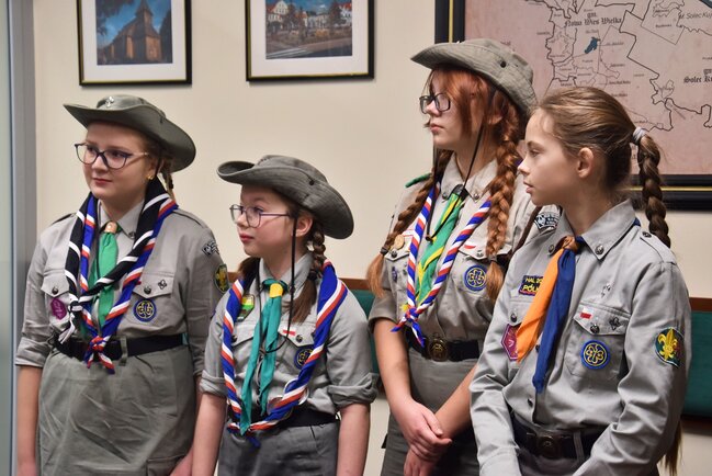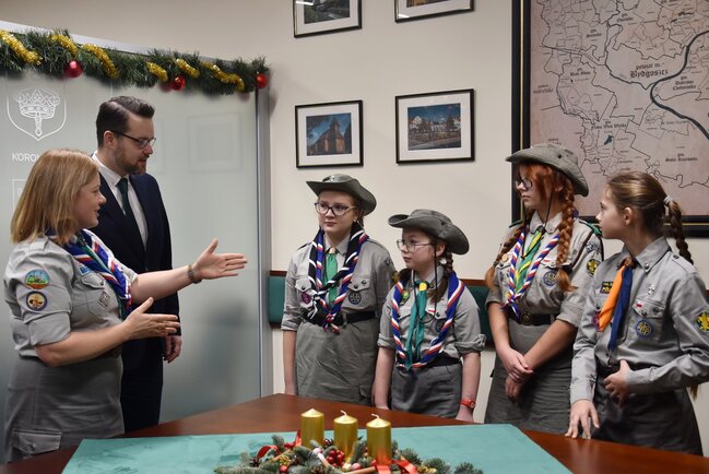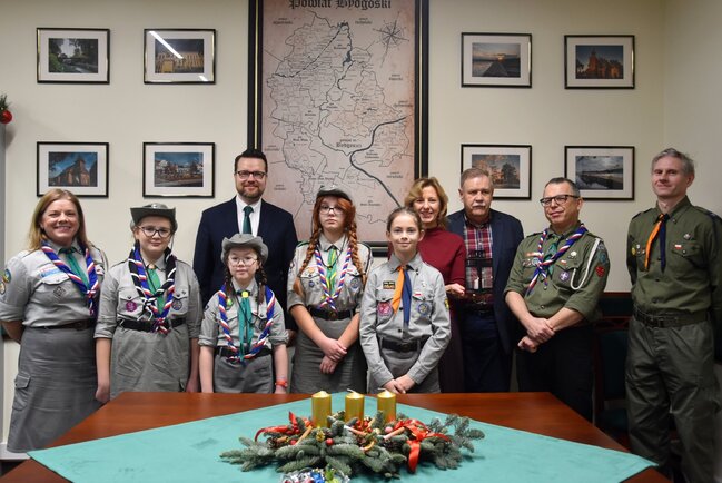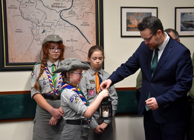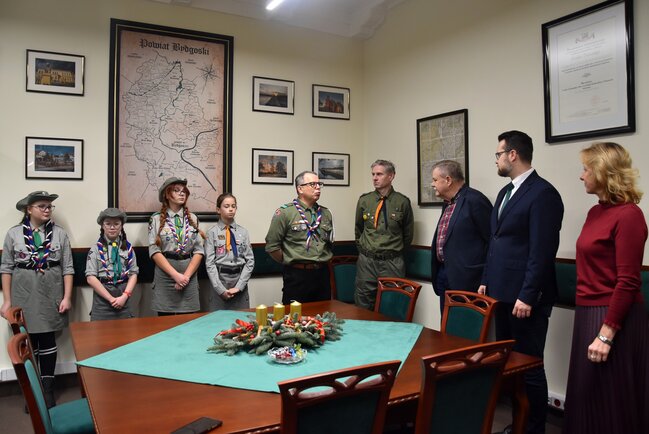 Przedstawiciele Hufiec ZHP Bydgoszcz-Miasto Komendant Hufca hm. Krzysztof Kobus, Zastępca Komendanta hm. Beata Kobus, pwd. Jarosław Rożański oraz druhny przekazali Betlejemskie Światło Pokoju Staroście Piotrowi Kozłowskiemu, Wicestaroście Zbigniewowi Łuczakowi oraz Członkowi Zarządu Iwonie Lichockiej.