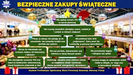 Wybierając się na przedświąteczne zakupy zwracajmy szczególną uwagę na swoje mienie i zabierajmy ze sobą tylko to, co będzie nam niezbędne. Zachowajmy również szczególną ostrożność w miejscach zatłoczonych, takich jak: sklepy i targowiska, przystanki autobusowe i tramwajowe, dworce kolejowe, środki komunikacji publicznej.