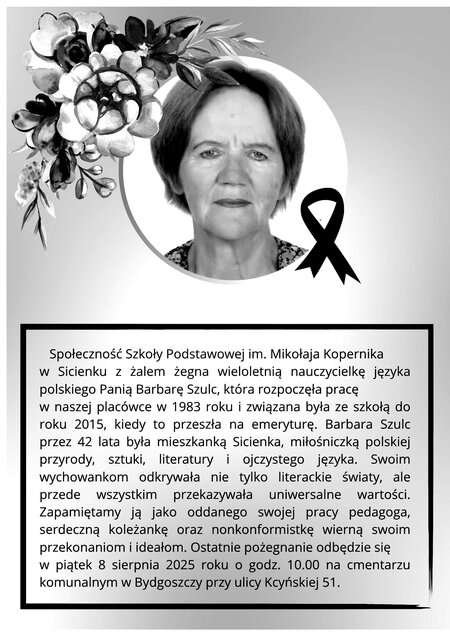 Zmarła wieloletnia nauczycielka języka polskiego w # Szkole Podstawowej im. M. Kopernika w Sicienku - śp. Barbara Szulc.