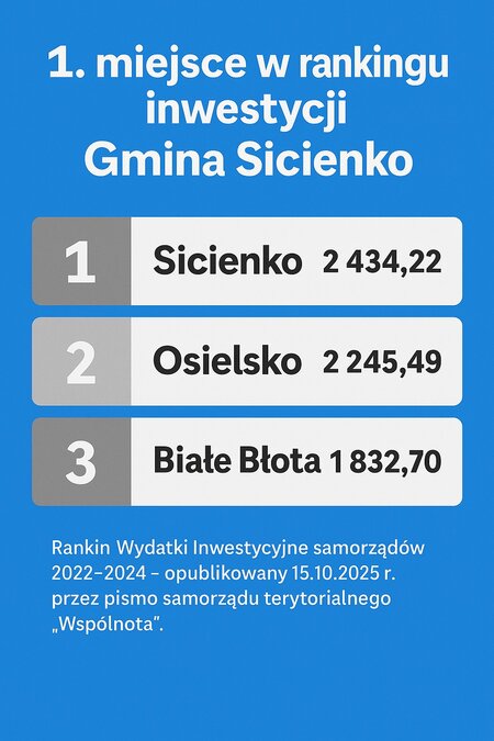 W najnowszym Rankingu Wydatków Inwestycyjnych Samorządów 2022–2024, #opublikowanym 15 października 2025 r. przez najstarsze w Polsce pismo samorządu terytorialnego „Wspólnota”, Gmina Sicienko zajęła 1 miejsce wśród gmin powiatu bydgoskiego!