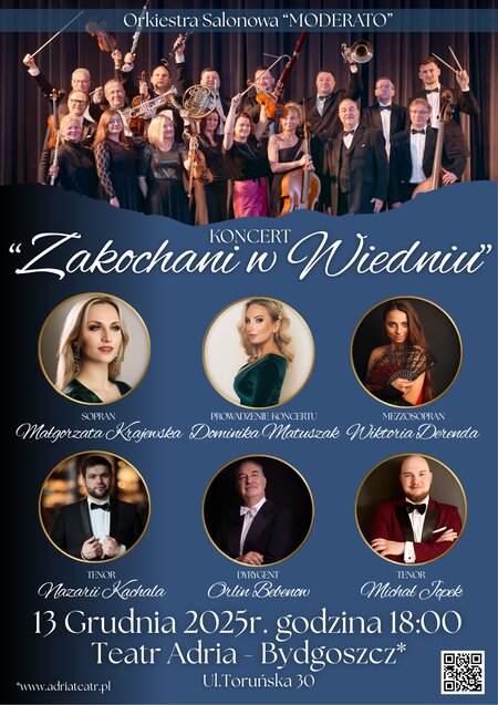 Artystom towarzyszyć będzie Orkiestra Salonowa MODERATO, która wprowadza specyficzny klimat muzykowania i dostarcza niesamowitych doznań. Orlin Bebenow to dyrygent pochodzący z Bułgarii od lat związany z Bydgoszczą, jest autorem większości opracowań muzycznych utworów specjalnie zaaranżowane na koncert "Zakochani w Wiedniu". Jego styl, sposób prowadzenia i wyjątkowe poczucie humoru, to gwarancja doskonałej zabawy z publicznością. Soliści: Małgorzata Krajewska - sopran Wiktoria Derenda - mezzosopran Nazari Kachala - tenor Michał Jopek - tenor Dominika Matuszak - prowadzenie Orkiestra Salonowa "MODERATO" - dyrygent - Orlin Bebenow. To zespół muzyków z Bydgoszczy, który został założony z myślą o stworzeniu dla publiczności niepowtarzalnej atmosfery i specyficznego klimatu muzyki wiedeńskich salonów, koncertów promenadowych.